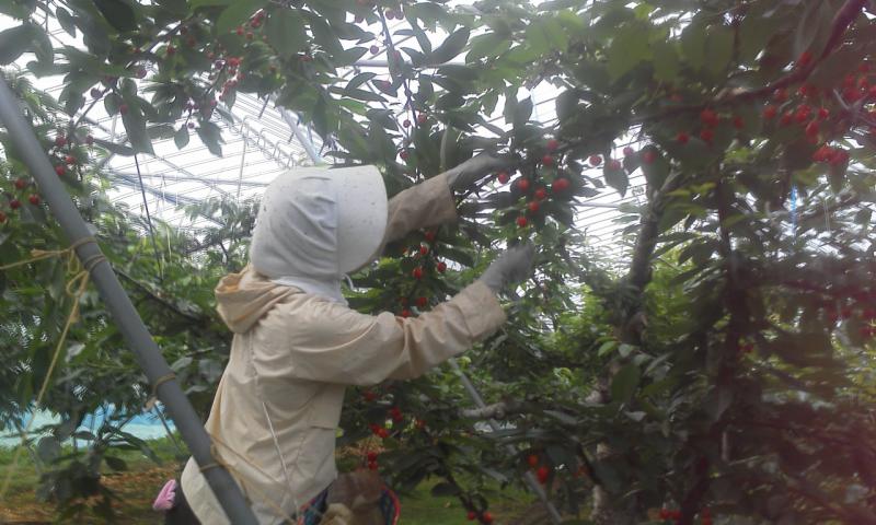 収穫作業をしている、美人の渡辺さんは、ナポレオンは可愛らしいし、美味しいから大好き、と言いながら、朝の四時から最後の追いこみ作業中です。