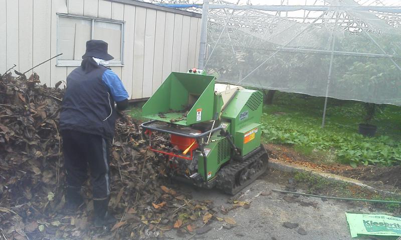 九月に入ってから始めましが、剪定がようやく終わり、集めた枝をチップにして堆肥作りの材料のひとつにします。来春まで何度か切り返しを行い、剪定した園地に戻す予定です。