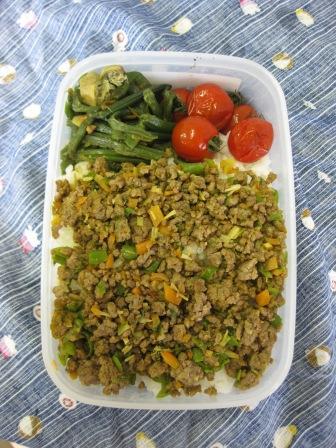 ○ご飯にドライカレー(牛と豚の合挽き肉、ピーマン・にんじん)