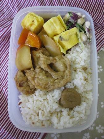 ○ご飯、めがね麩唐揚げ甘じょっぱ煮(汁がご飯に滲みていてかなり美味