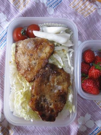 ○さらにその上に豚肉(厚い豚肉に片栗粉をまぶして、だし醤油で味付けして焼い たもの。これ、なんていうんでしょうね?!)