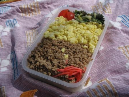 ○肉そぼろ(甘じょっぱい)、炒り卵をご飯の上に