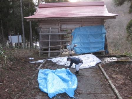 早朝5時半から大荒沢不動尊の雪囲い片づけ作業を、有志の皆さんに集まっていただき、実施。