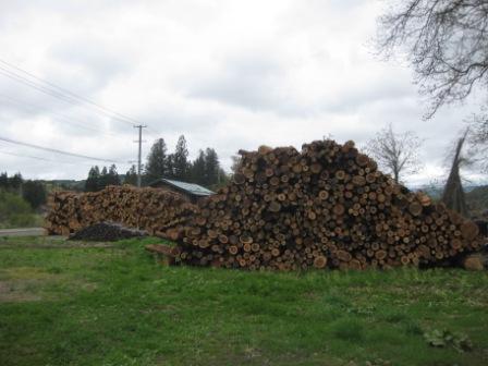 コミセン脇の森林組合の土地に、材木が積まれている。