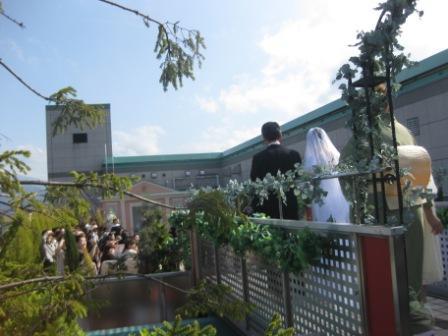 ガーデンウェディングというのでしょうか、グランドホクヨウの3階にある屋外の式場で人前結婚式でした。