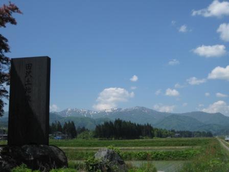 爽やかに晴れ渡り、大荒山の山並みにわずかに雪が残るのも、爽快に見える6月1日の田沢です。