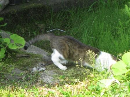 朝、わが雑草庵の周りを掃除していると、足を怪我したらしいわが飼い猫「たま」が右後ろ脚をぶらぶらさせながら、何かを狙ってる。