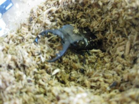 さて、昨日用があって田沢コミセンに行くと、クワガタが「道に落ちったった」ということで、飼育ケースに入ってました。