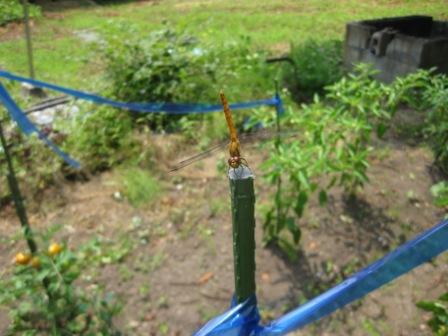 で、トマトの支柱にスズランテープを張って、所どころにリボンのようにヒラヒラとなびかせてみました。