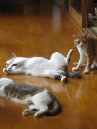 猫っだが廊下で引っくり返って寝ています。