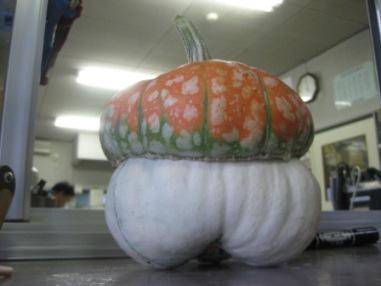 お盆前日、田沢コミセンに用があって行くと、玄関にかぼちゃが飾られていました。