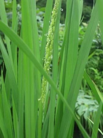 棚経まわりから戻ってミニ水田を見ると、稲に穂がようやく出ています。