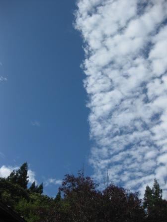 秋の空ともうしましょうか、こんなにくっきり青空と羊雲が分かれていて、頭上までぐうっと頭をそっくり返っして眺めても続いています。