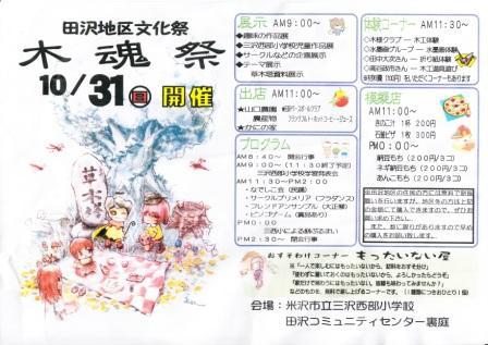 明日、10月31日(日)、田沢コミュニティセンター主催の田沢地区文化祭「木魂祭(こだまさい)が、三沢西部小学校と田沢コミセン裏庭をメイン会場に催されます。