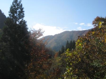 お堂から大荒沢の奥を望むと、山の中腹は紅葉し、山頂の方はすでに葉が落ちているようです。