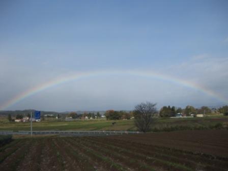 遠くに虹が出て、解説してくださっている藤田氏から後光が射しているようです。