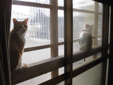 お寺の外側にはめられた雪囲いのパネルと、サッシ戸との間に空間ができて、猫たちにとって、陽が出ている時はとてもいい日向ぼっこの場所になっています。