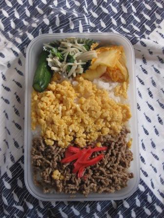○ご飯、卵と挽き肉のそぼろ with紅生姜