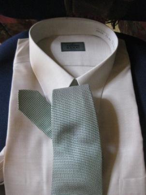 シャツとネクタイを、ちょこっと変えて、ネクタイの色にポケットチーフの色を合わせる、という程度の服装です。