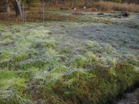 強い霜が降りて、草が白くなっていました。