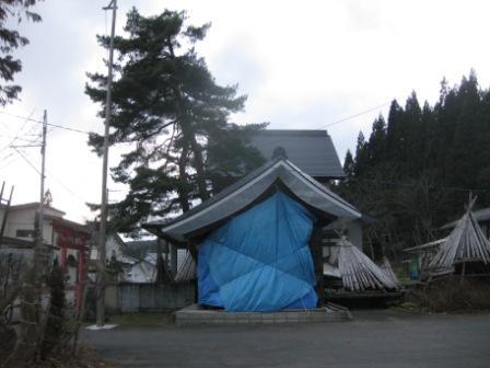 風が治まりかけの昨夕、お堂の雪囲いの修復を、とりあえず行いました。