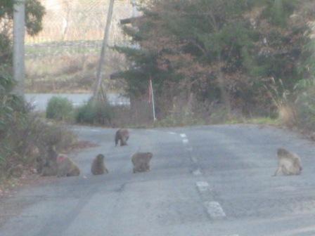 道端にクリの木があるのか、その下あたりでゆっくりと猿の群れが、拾っては食べています。