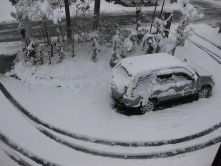 画像は朝、庭に停めたクルマにも雪が積もり、新聞配達の人の車の跡がサークルになっておりました。