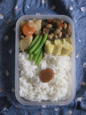 「う〜むむむむ。卵焼き…、五目豆……、インゲン・・・・・・・・、あどなんだっけ?」