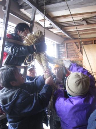 あとは、藁をすぐって束ねたりし、若い衆(集まった中で比較的若い、30〜40代)が、天井からつるした藁の束をなってゆきます。