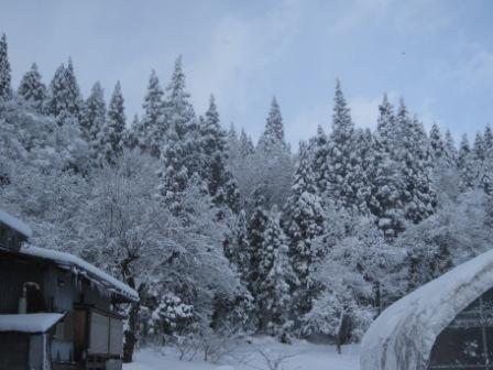 今朝は、樹に着いた雪が、かんじだ(寒かった)せいで華が咲いたようになっておりました。