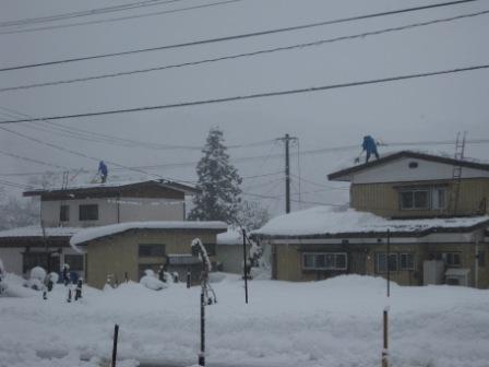 向かい側の家2軒の人が、朝から屋根に上がって雪を下しております。