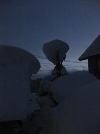 夕闇の中に、隣の伐った松の木の脇に、植木の囲いがあり、そこに積もった雪がトロフィーのように見えました。