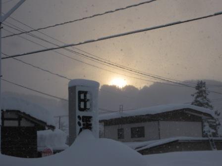 山の端から陽が昇ってきて、雪ながら天気は悪くない。