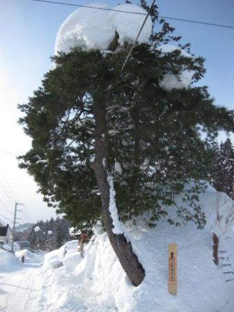 お寺の前の松の木に雪がたまり、天辺に大きな塊りになっている。