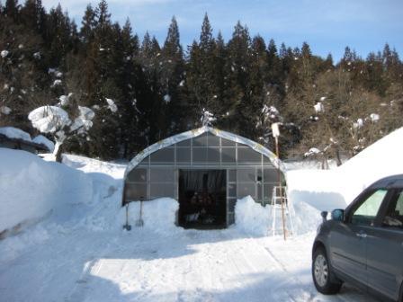 パイプ車庫の雪が落ちなくて、固まってしまっているので、「砂はき」という道具と脚立を使っておとすのです。