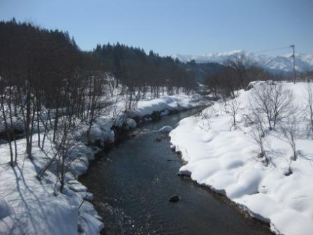 小樽川から上流を望み、遥か彼方の山は真っ白。