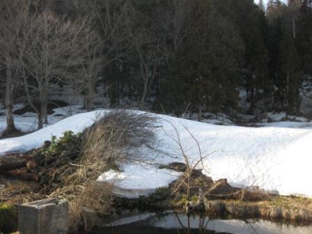 わが家の裏には、まだ雪が残っており、特に除雪機で飛ばした雪の山がなかなか融けない。