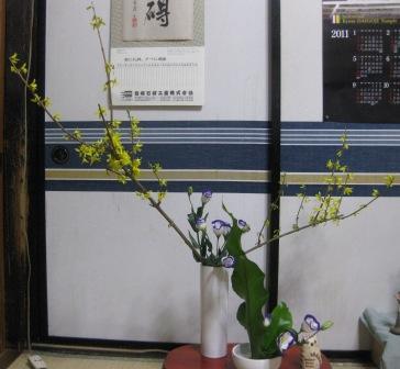 花材は、レンギョウとトルコ桔梗。