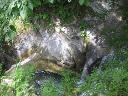 それほど大きな滝ではありませんが、2段になっている滝の上の滝つぼが釜のようになっていて、緑がかったきれいな水を湛えており、なんとも神秘的です。