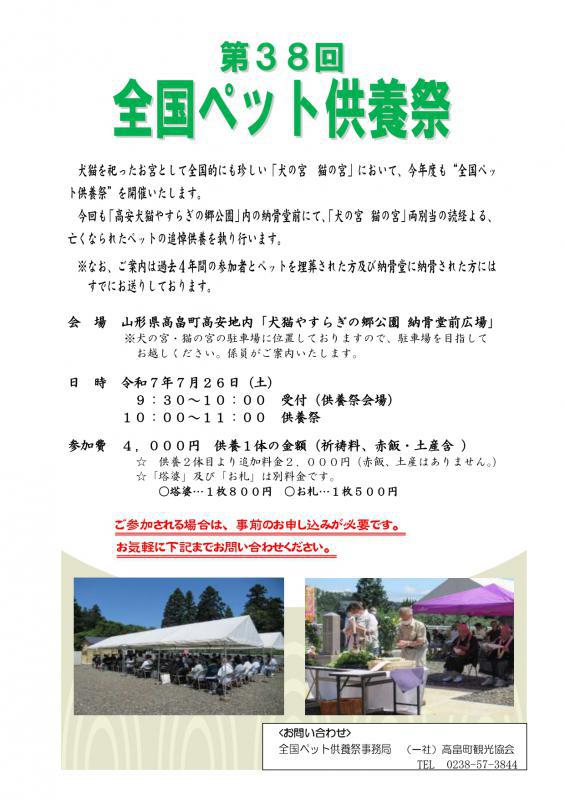 高畠町高安地区にある、「犬の宮」「猫の宮」は全国的にも珍しい犬猫を祀った社で伝説的な物語としても長い間語り伝えられてきました。更に故戸川幸夫氏の直木賞受賞作品「高安犬物語」の舞台としても紹介されています。 『犬の宮』は、安産と無病息災の神、『猫の宮』は、養蚕と商売繁盛の神として古くから信仰されてきましたが、特に近年では世界的なペットブームに乗って、ペットの供養や健康祈願に訪れる参拝者で賑わっています。町を挙げて全国ペット供養祭を開催することで、ペットの供養・健康祈願はもちろん、祭りを通しての地域活性化を目的とし、今年で38回目を迎えます。