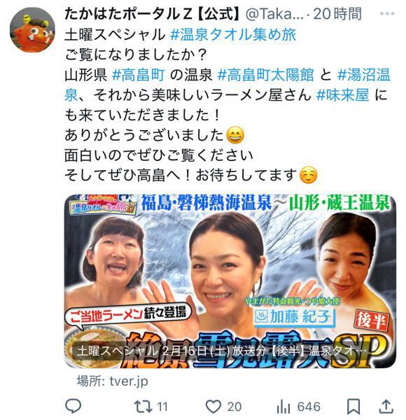 ▼テレビ東京「温泉タオル集め旅」で高畠町にお立ち寄りいただきました!