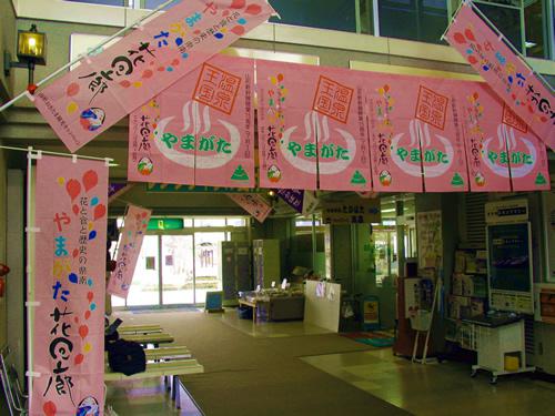高畠町太陽館(JR高畠駅)内にものぼり&啓翁桜を設置を設置しました