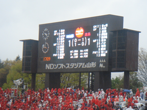 サポーター」が、雨天にもかかわらず、必死で声援を送っていました。山形の上空