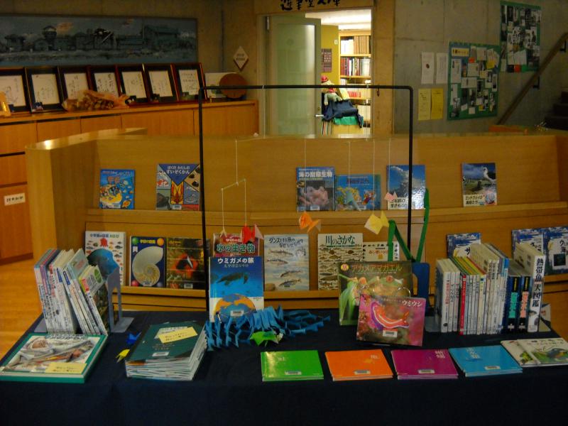 そして、カウンター前では、夏休みの宿題、自由研究に役立つ本の展示を行っています。事典などを除くほとんどの本は貸出可能です。