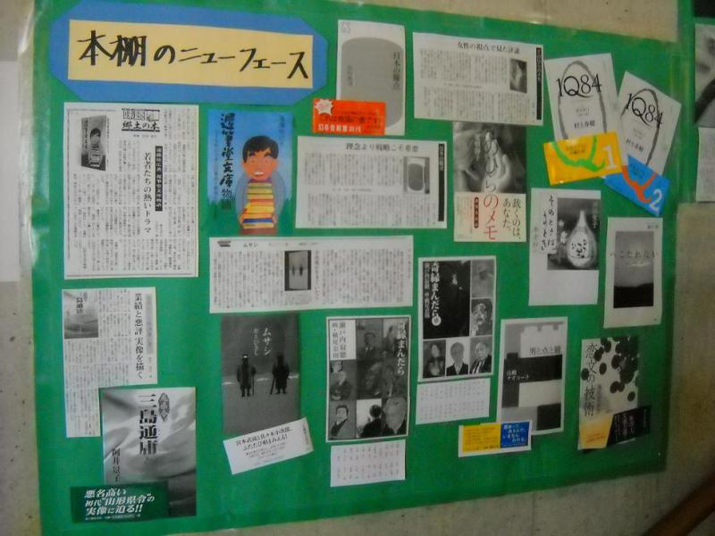 2階への階段脇にある「本棚のニューフェース」のコーナーです。