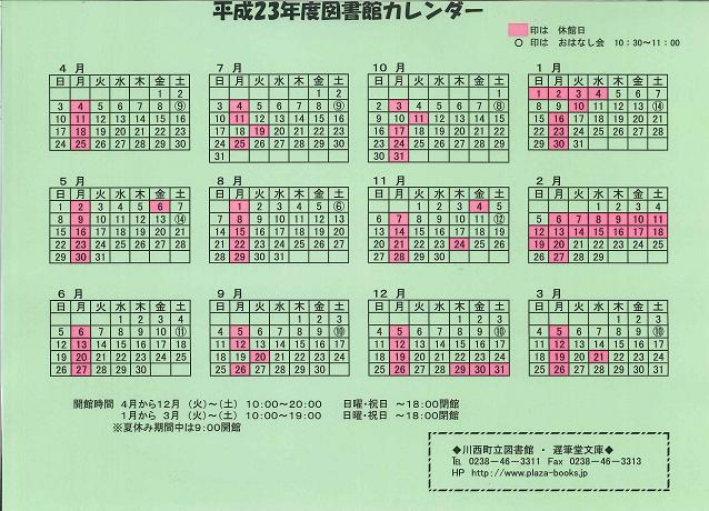 遅筆堂文庫・川西町立図書館の平成23年度開館日・休館日が一目でわかるカレンダーです。ご来館の参考にお使いください。