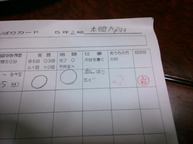 P君の今日のお手伝いの欄に、‘血はこび‘と・・・・・。
