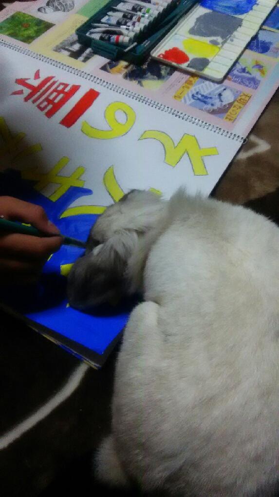 P君が春休みの宿題のポスターを、休み終わり寸前にかいていたら、我が家の