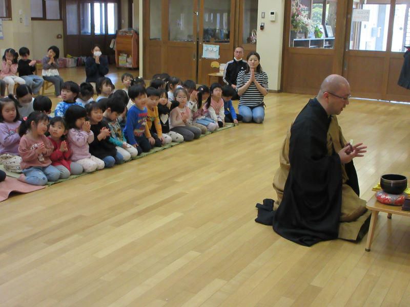 園長先生にお経をあげていただき、みんなで手を合わせました。お釈迦様が生まれた時のお話を聞き、誕生の時に空から降ってきたといわれている“甘茶”をお釈迦様にかけてお祝いをしました。幼児組は、甘茶はどんな味なのか実際に飲んでみました。「お釈迦様はこんな味が好きなのかな?」「不思議な味がする~」という声が聞かれるなど、さまざまな反応が見られました。