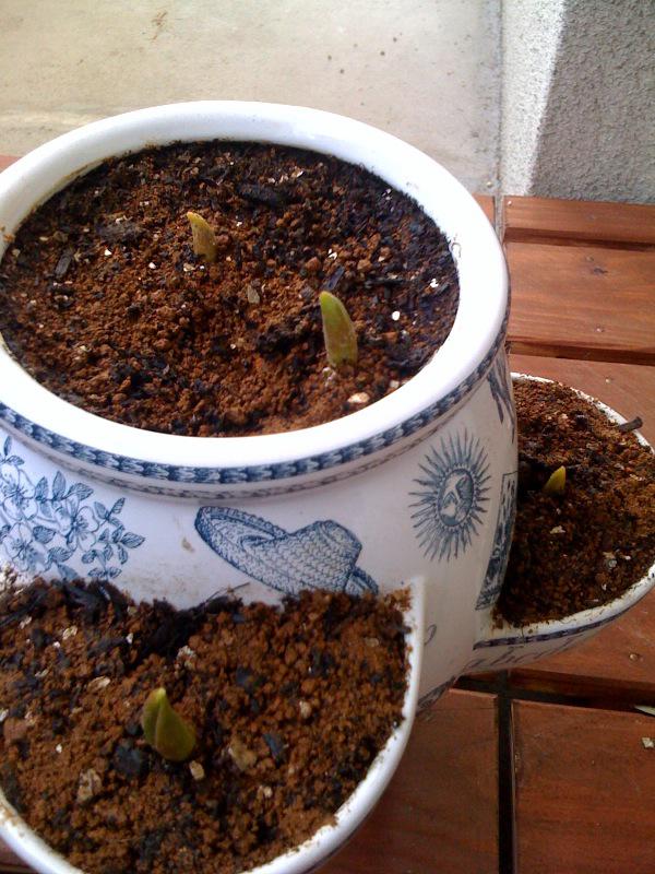ベランダに鉢植えしたチューリップの芽がつぎつぎと顔をのぞかせ、